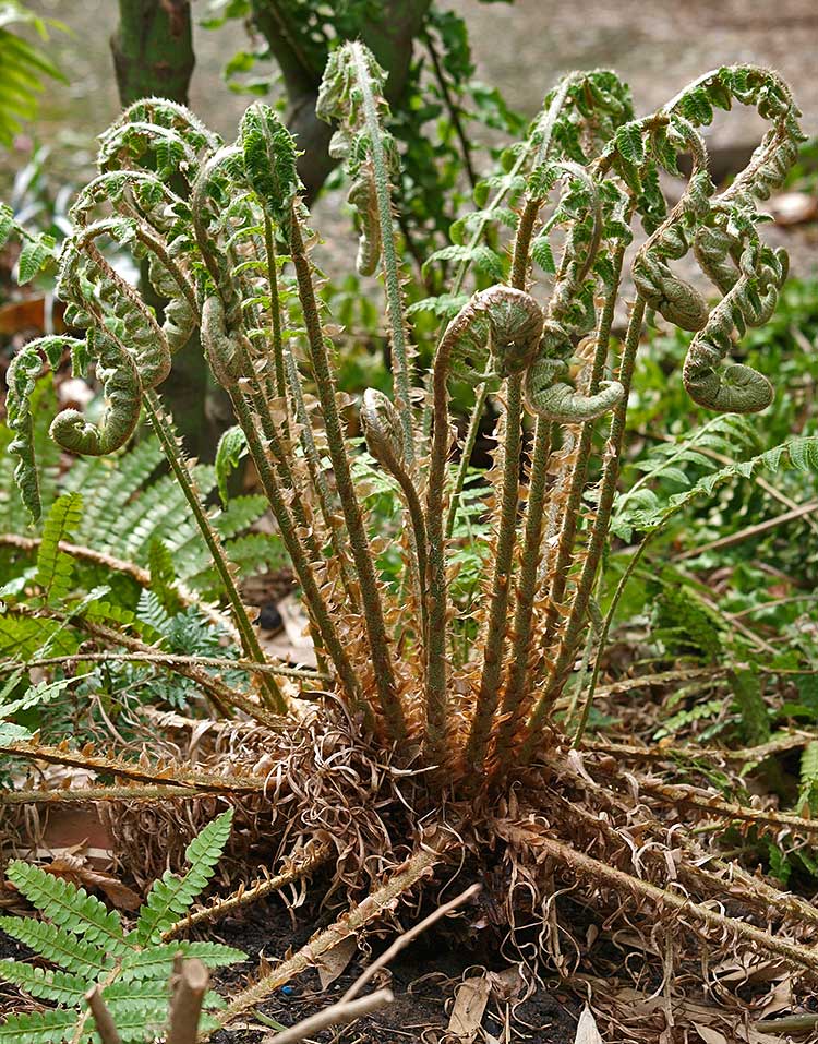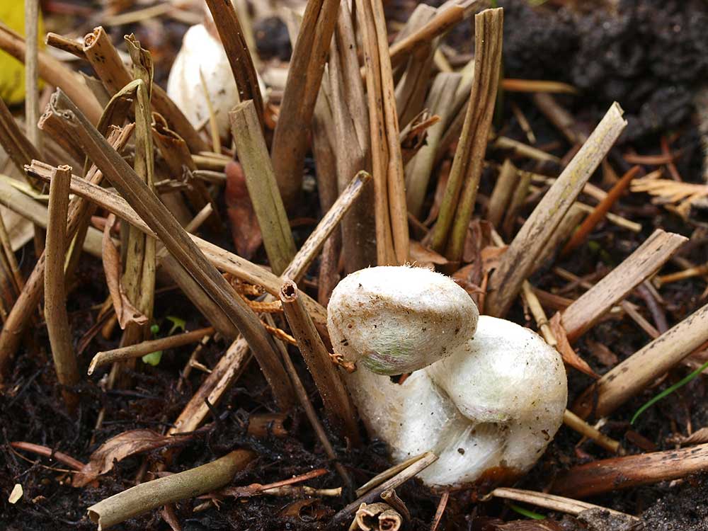 Der Austrieb des seltenen Königsfarnes/*Osmunda lancea*/ sieht aus, als wäre er eingesponnen.