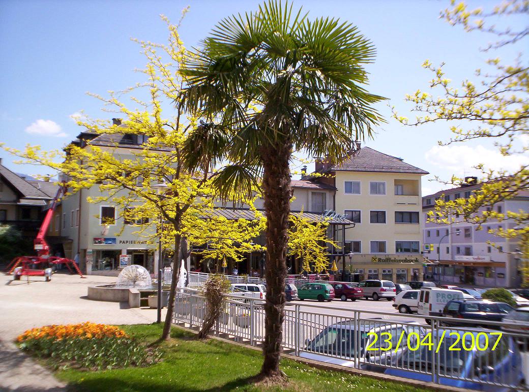 Diese großen Palmen stehen am Ortsplatz, sie sind an die 5m hoch. Rein zufällig traf ich den zuständigen Gärtner, der gerade fleißig am Werkeln war. Der erzählte mir, daß die großen Palmen seit immerhin 5 Jahren ausgepflanzt sind, im Winter erhalten sie eine atmungsaktive Verpackung über die zusammengebundenen Blätter. Die großen Trachies stammen allessamt aus dem nahen Friaul/Italien.