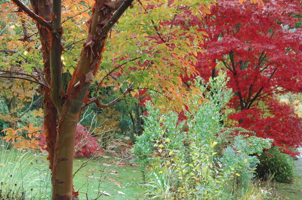 Acer griseum mit seiner braunen Rinde neben der graublauen /*Baccharis halimifolia*/ und dem karminroten Acer palmatum #AM (!!!!!!!)