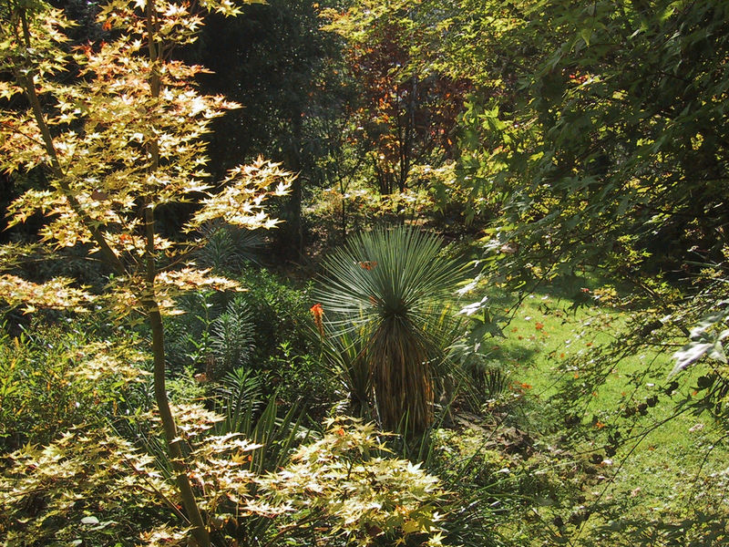 Leuchtend gelb färben sich die Blätter von /*Acer palmatum Sangokaku*/, zentral Yucca linearifolia