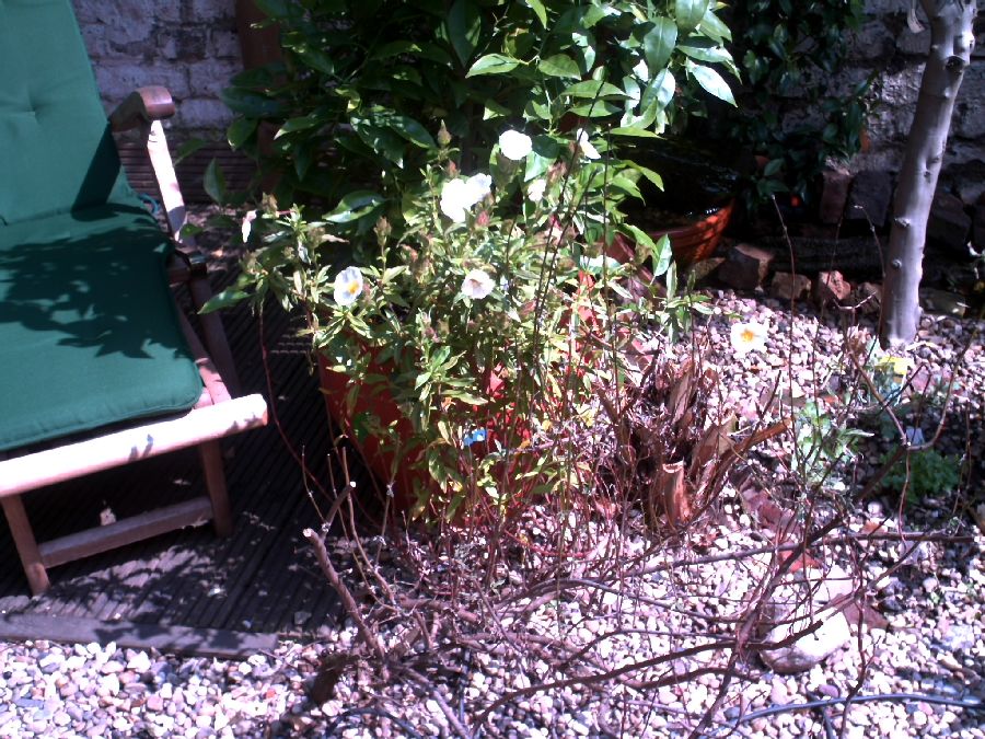 Neupflanzung Cistus Laurifolius, davor zu 99% kaputter C.Ladanifer , rechts erforene ( zu spät, erst bei -8° geschütze, ab 1.Januar) Phoenix c.