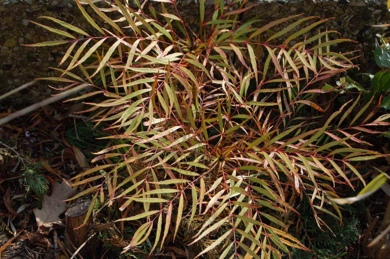 /*Mahonia eurybracteata Soft Caress*/ lebt noch, hat aber den größten Teil ihrer Blätter verloren!