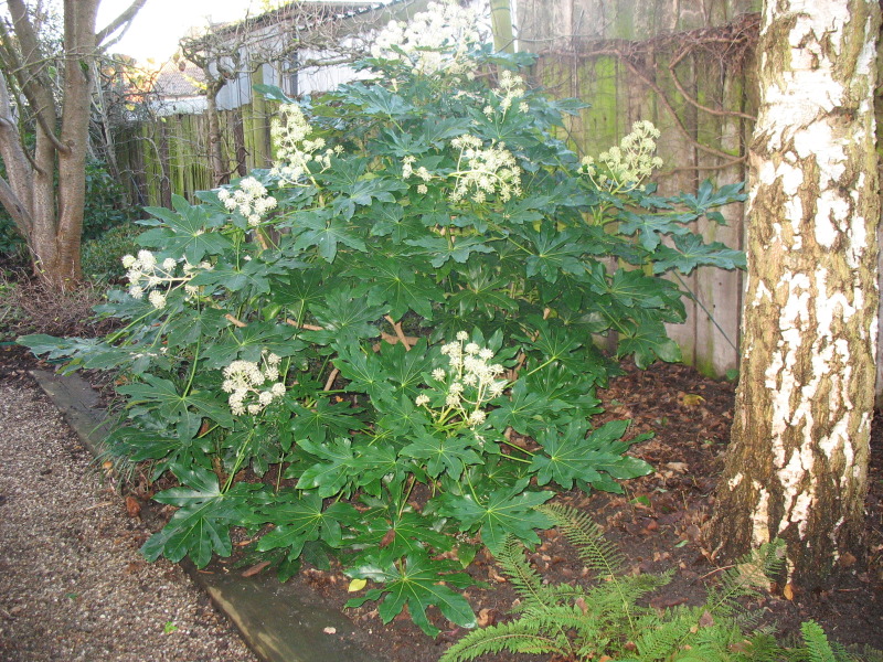 zeigt sich auch noch in Blüte und gedeiht bestens hier im Schlagschatten zwischen den Bebäuden und im Wurzeldruck einer Birke (vom Wurzeldruck wird sie bald befreit, denn die Birke wird noch diesen Winter zu Kaminholz verarbeitet)