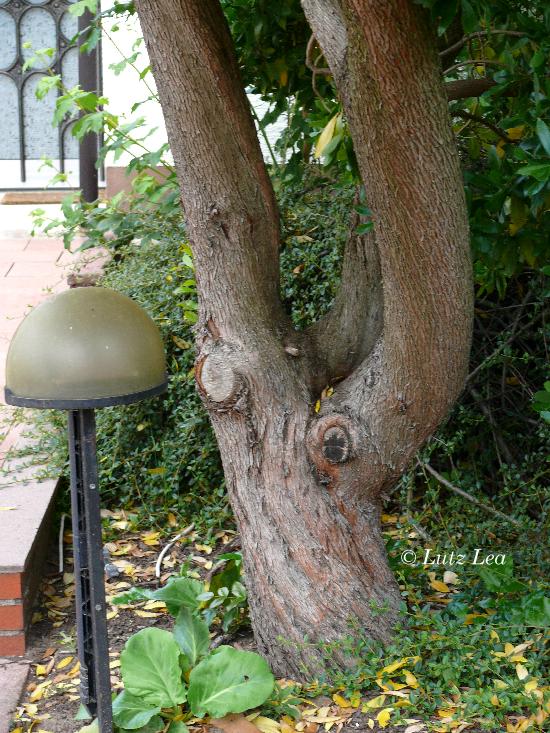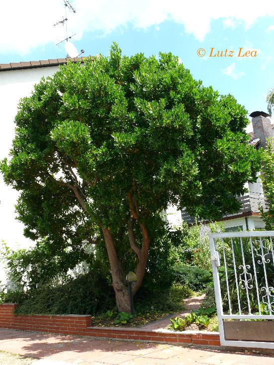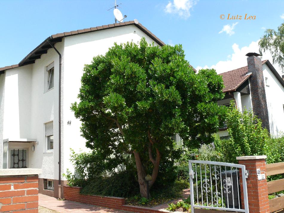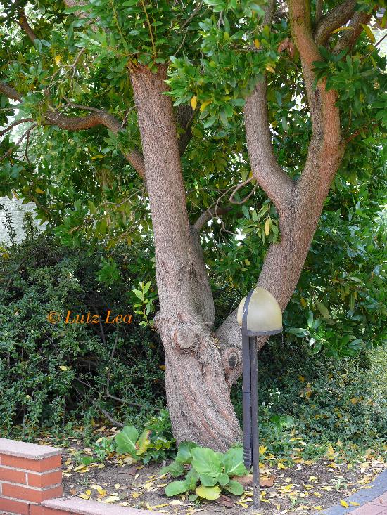 Der gut 4,5 m hohe Erdbeerbaum ist nach Auskunft der Besitzer seit ca. 1979 ausgepflanzt und machte im Winter noch nie Probleme. Im August 2004 maß ich in 25 cm über dem Erdboden einen Stammumfang von 72,5 cm!