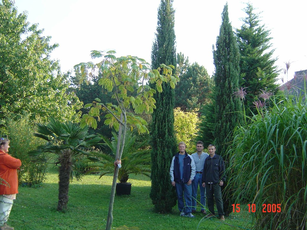 Mittelmeerzpressen, Albizia, Trachycarpus wagnerianus (v. l. Claudia, Karl, Peter und Robert):