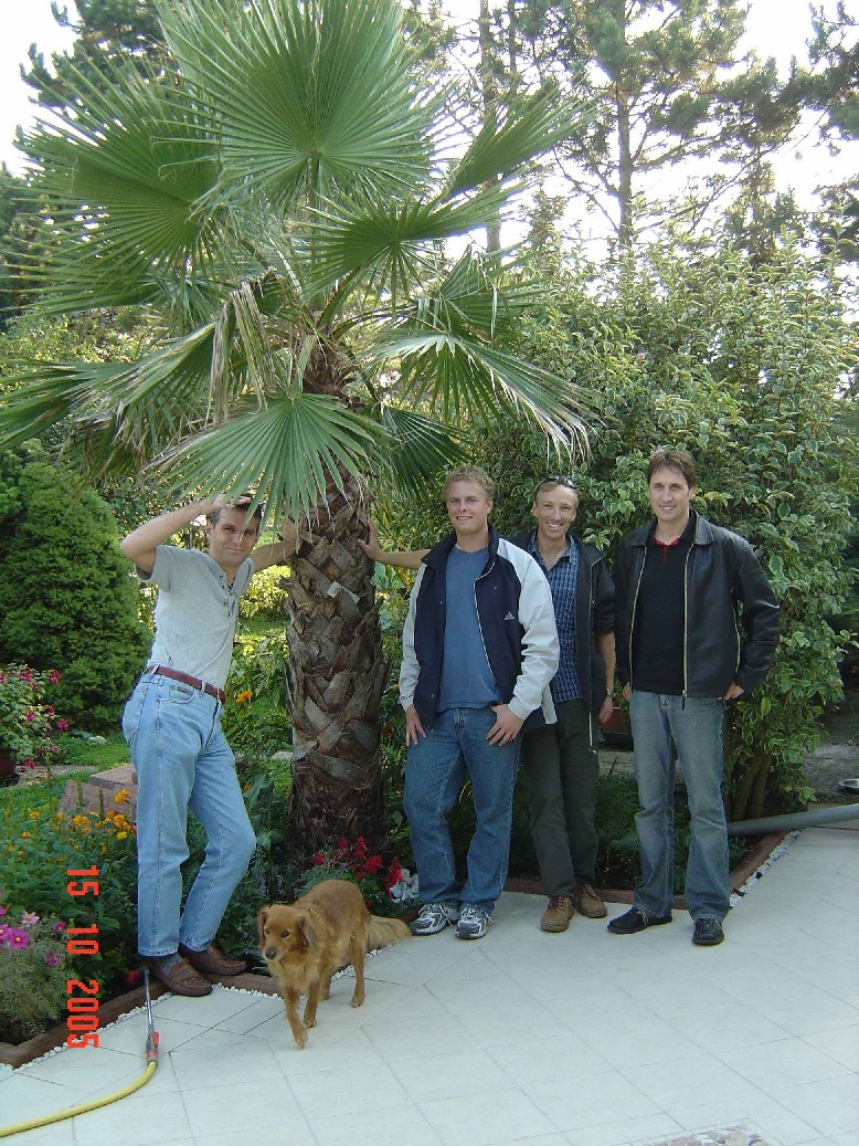 Die ausgepflanzte Washingtonia robusta im Garten seines Elternhauses mit (von links) Peter, Karl, Robert und mir: