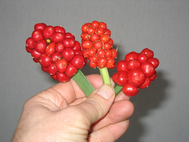 In den Beeren befinden sich wiederum eins bis mehrere Samen. 1 - 3 ist relativ häufig, maximal fand ich bisher 6 Korn, das ist aber relativ selten. Von der Beerengröße auf die Samenzahl zu schließen ist äußerst schwierig, da die Samen wiederum sehr unterschiedlich in der Größe ausfallen, noch dazu haben manche Beeren ordentlich Fruchtfleisch, andere praktisch gar keins. Bei so einem ordentlichen Fruchtkolben sind durchaus einmal 100 Korn zu realisieren.