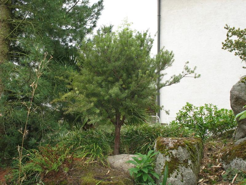 Letzte Woche habe ich mich endlich getraut und zugeschlagen. Seit 2 Jahren schon hatte ich dieses Einzelstück in der Baumschule im Visier: Podocarpus acutifolius von der Südinsel Neuseelands. Ein absoluter Ladenhüter war das dort und als ich die Pflanze auf den Einkaufswagen zog, meinte eine Kundin "so ein hässliches Ding!" Ja, Pflanzenliebhaber und Exotisten ticken eben anders als der normale Gartenbesitzer und deswegen ist es auch kein Wunder, dass sich Baumschulen und Gartencenter die Objekte unserer Begierde erst gar nicht hinstellen.
