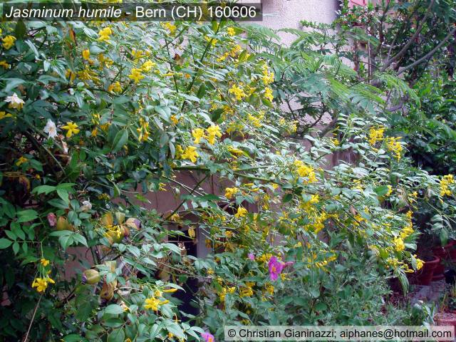 Jasminum humile ’Revolutum’ ist ebenfalls gut winterhart und dürfte der einzige gelb blühende Jasmin sein, der duftet (allerdings nicht so aufdringlich wie Trachelospermum). Z.z. blüht auch noch J. officinalis.