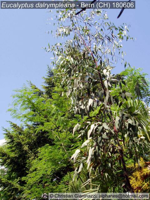 Eucalyptus dalrympleana hat sich über die Jahre als eine der härteren Arten erwiesen. Der obere Teil des Haupttriebes ist rot (auf dem Bild leider schlecht sichtbar), was einen schönen Kontrast zum grünen Laub darstellt. Im Hintergrund zu erkennen: verblühte Trachy, Albizzia julibrissin und Melia azaderach in Vollblüte (auf dem Bild leider nicht sichtbar).