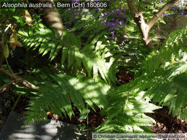 Der Baumfarn Alsophila (Cyathea) australis hat sich ebenfalls als gut winterhart erwiesen; ohne Schutz sind im Laufe der Jahre alle Dicksonia antarctica (der gleichen Grösse) erfroren, aber A. australis hat sich immer gut gehalten. Selbst das Laub ist relativ frosthart und erfriert nie komplett. Eine der grössten Überraschung bezüglich Winterhärte ...