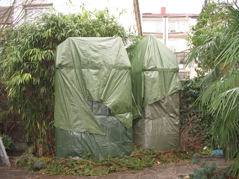 ... mit Gewebeplanen verhüllt. Die Planen sollten nicht zu knapp bemessen sein und gut überlappen. Für die beiden "Türme" wurden jeweils zunächst eine Plane von 8 x 6 m verwendet und dann zusätzlich oben eine der Größe 6 x 4 m drübergebunden. So verpackt sollte die aufsteigende Wärme gut gefangen werden. Bleibt zu hoffen, dass die biologisch-dynamische Heizung auch diesen Winter wie gewohnt funktioniert.