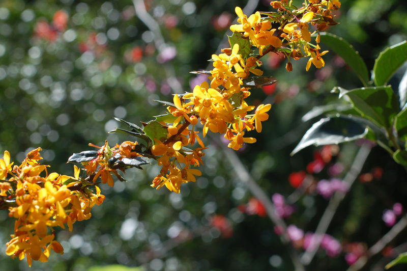 /*Berberis lologensis*/ vor den jetzt erscheinenden violettfarbenen Blüten von Cercis canadensis blüht schon seit Wochen!!!! einfach ein Gedicht