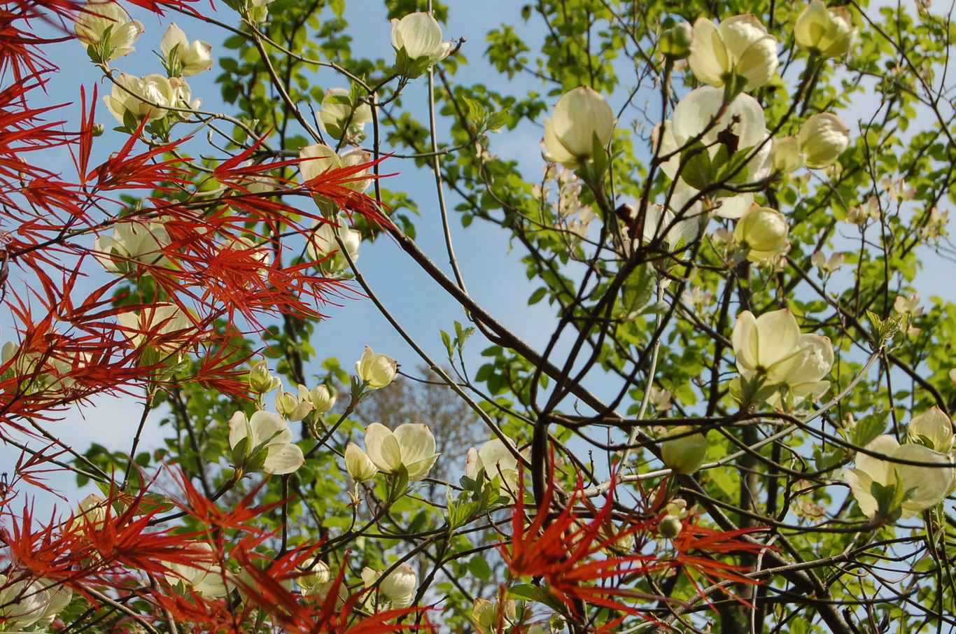 ist ihre 2xlige intensive Verfärbung sowohl im Frühling als auch im Herbst.Hier /*Acer palmatum linearifolium Villa Taranto*/ mit Cornus 'Edddie's White Wonder*/#AM