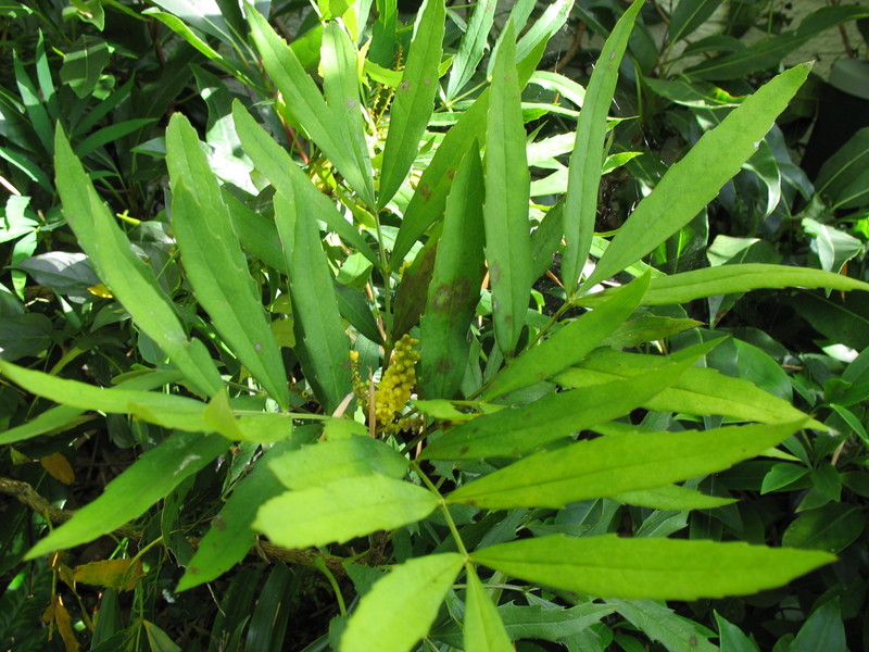 Mahonia fortunei blüht schon seit geraumer Zeit, recht unscheinbar. Die Pflanze wirkt jedoch durch ihre Struktur und Blätter
