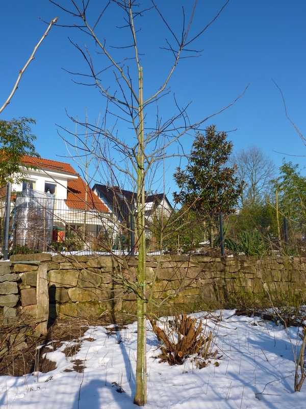 Hier Crataegus mollis mit stark geschwollenen Knospen als Teil meiner neuen Crataegus-Anlage mit einheimischen und exotischen Sorten, u.a. C. mexicana var. stipulaceae und C. schraderiana.