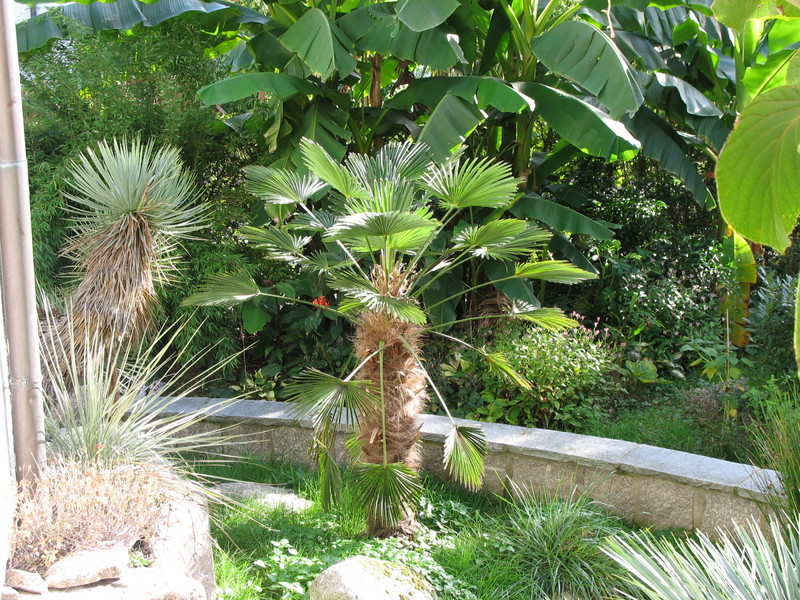 Diese Waggi ist seit 13 oder 14 Jahren ausgepflanzt und kommt langsam wieder in die Gänge, nachdem ich sie bei der Umgestaltung dieses Gartenteiles vor 4 Jahren herausnehmen mußte und einige Wochen im Kübel zwischengeparkt hatte. Die Palme hat danach geschmollt und auf langsamstes Wachstum umgeschaltet, aber seit diesem Jahr legt sie wieder deutlich zu.
