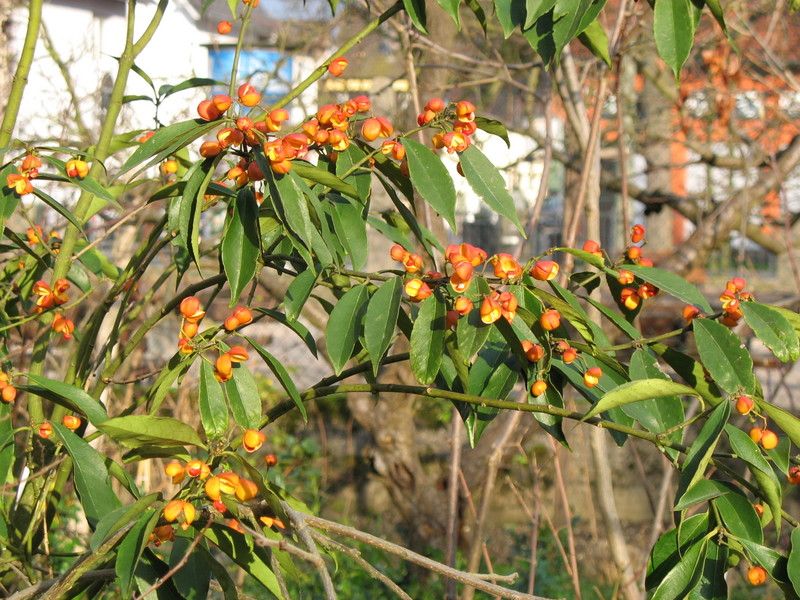 Nein mit Laubfärbungen ist es vorbei. Aber Farbe gibts immer noch wie die lang haftenden Früchte dieses atraktiven immergrünen Spindelstrauchs zeigen. Mein Favorit unter den Pfaffenhütchen, doch leider von den Baumschulen immer noch ignoriert.