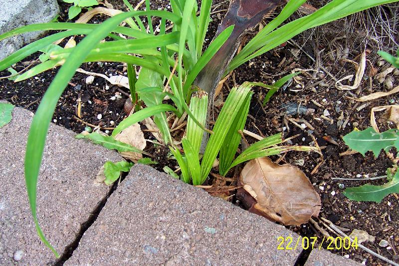 ... da hier männliche und weibliche Trachies eng beisammen stehen, blieb natürlich der Palmennachwuchs nicht aus. Überall in den Pflanzinseln der "Eltern" sind Sämlingspälmchen zu finden, die im milden Frankfurter Innenstadtklima bestens gedeihen. Die runtergefallenen Samen keimen hier gut, da die Pflanzbeete immer gut feucht gehalten werden.