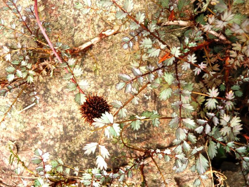 das Silberblättrige Stachelnüsschen /*Acaena ergentaea*/Ruiz & Pav. aus den Südamerikanischen Anden (dieses hie ex Peru) ist nicht ganz so robust wie viele andere der Gattung, aber schön silbrig (im Schatten) bis silbrig-violett oder etwas violetter in voller Sonne. Veträgt Hitze und Frost nicht ganz so gut wie andere, ist bei der Herkunft aber dennoch erstaunlich dass er hier schon Jahre durchhält. Südlichere Herkünfte sind aber vielleicht weniger empfindlich.