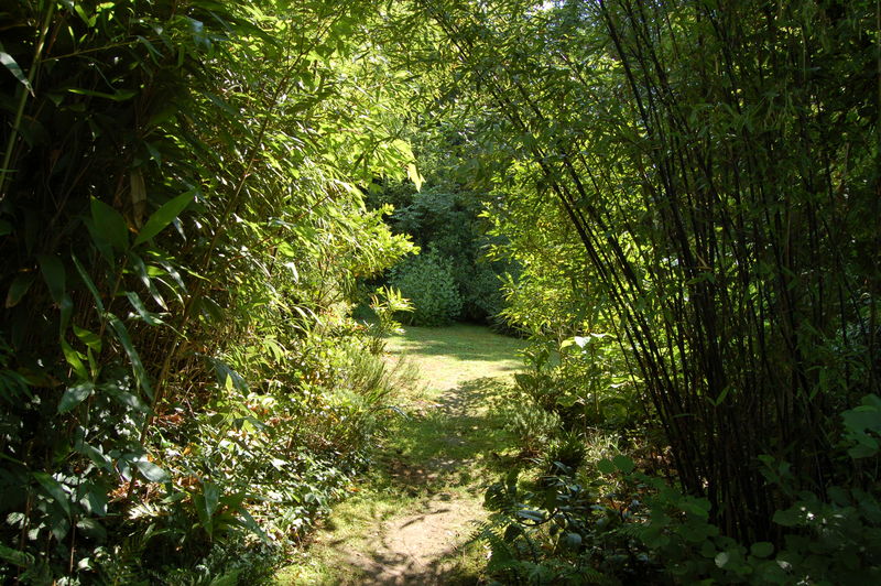 ...in neue "Räume". Hinten graublau ein hoher Romneya Busch.Li Mahonia fortunei, vorne re /*Phyllostachys nigra Punctata*/
