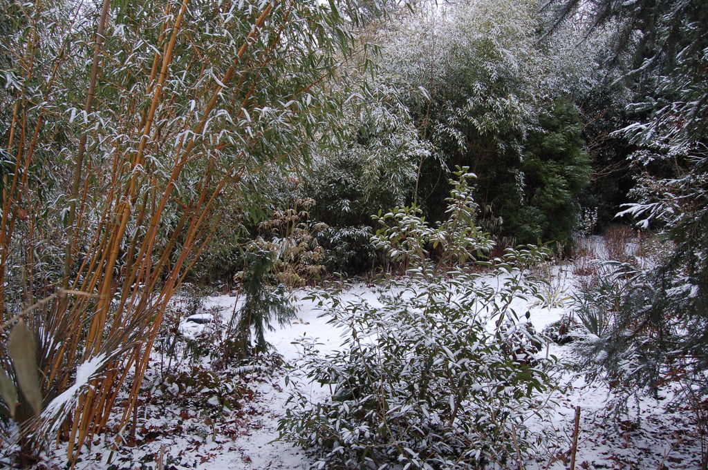 von Trachycarpus!!. Ebenfalls sehr dekorativ im Schnee:/*Osmanthus decorus*/ in Bildmitte