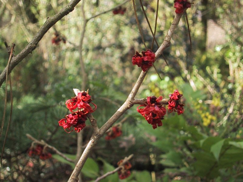 /*Hamamelis int. Diane*/ im Austrieb vor Mahonia media Charity