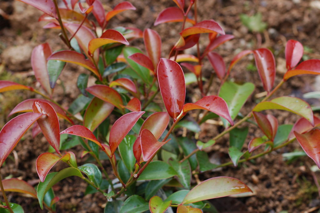 /*Cleyera japonica*/, ein immergrünes ostasiatisches Teegewächs mit rotlaubigen Jungblättern