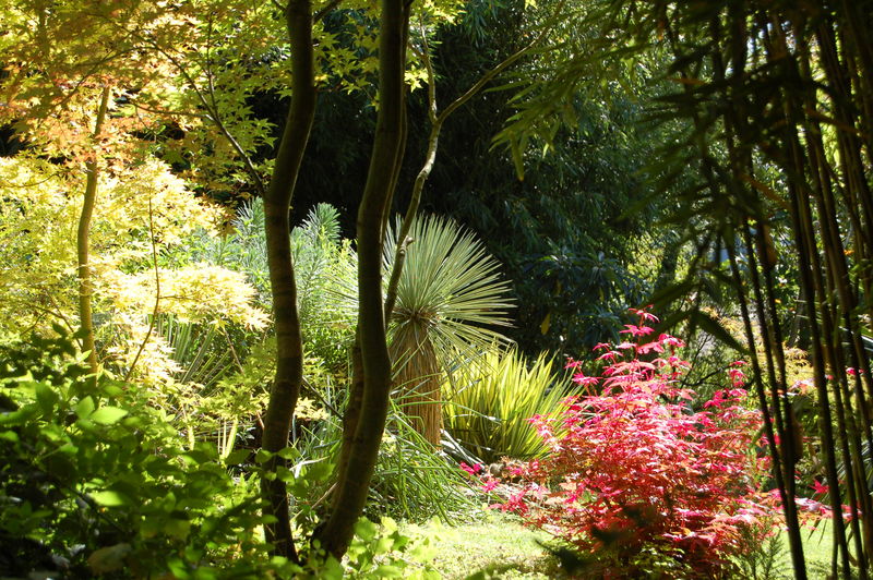 /*Yucca linearifolia*/ zwischen gelbem Acer palmatum Sangokaku und rotem Acer palmatum Shindeshojo