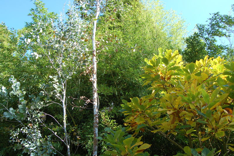 /*Eucalyptus gunnii Silver*/ neben /*Quercus pontica*/ und Bambus