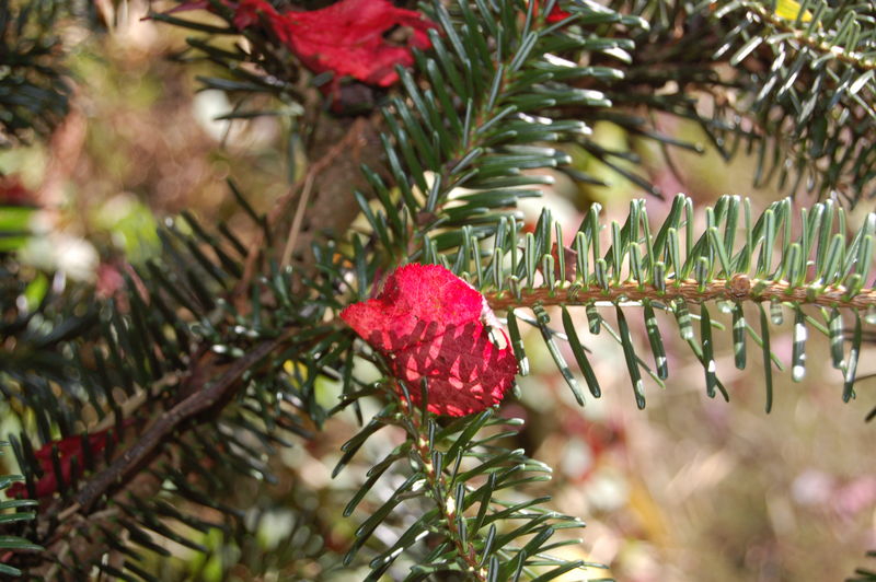 /*Abies numidica*/ schmückt sich mit den Herbstblättern der rotbl. Zierpflaume