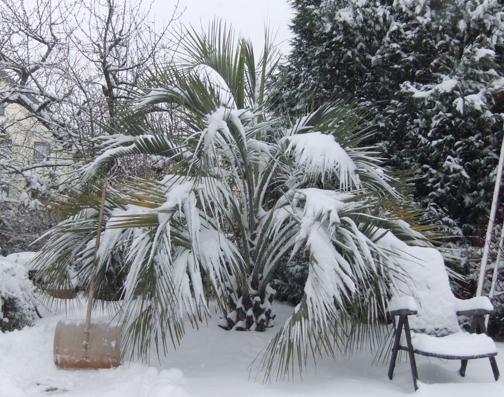 am 12.03.2013 starker Nasschneefall mit anschließendem Eistag u Tmin in der Nacht von knapp -9°C(hart an der Grenze für die Mimosenhafte Butia,aber es geht weiter