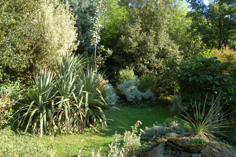 Quercus phillytroides,/*Rhamnus alaternus Argenteovariegatus*/,Quercus ilex,Acer griseum, vorne li Artemisia arb.Powis Castle, re vorne Seseli.......