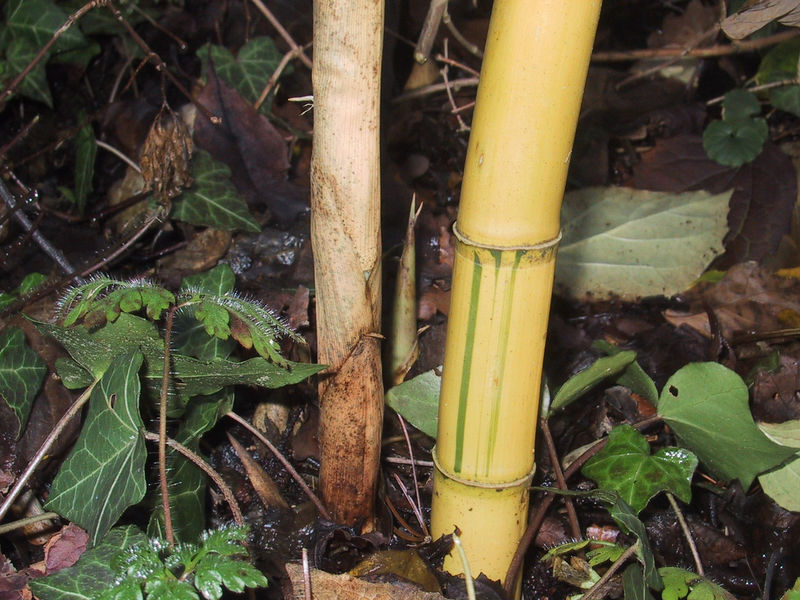 /*Phyllostachys viridis f. youngii/* (ehem. sulphurea Robert Young) treibt immer noch aus! Typisch die wie mit einem Tuschepinsel ausgeführten grünen Streifen auf gelbem Grund!