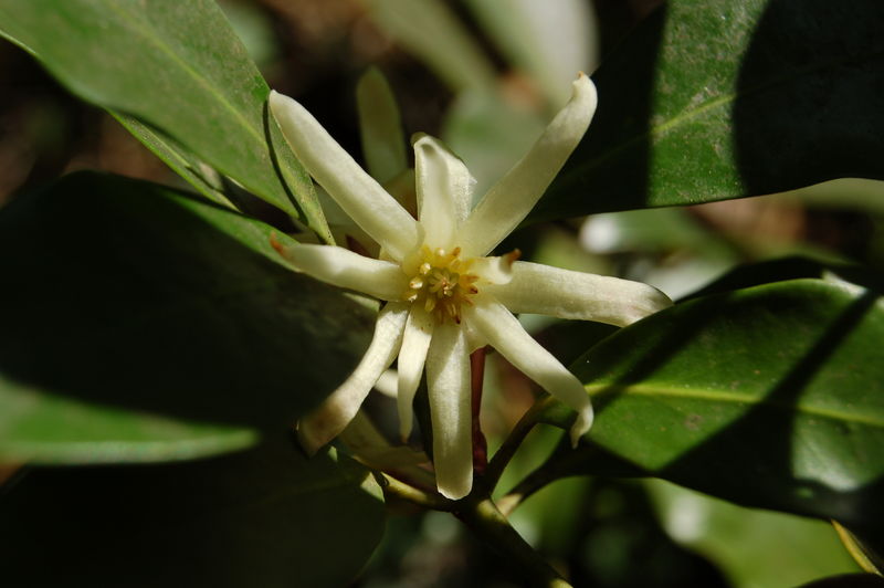 /*Illicium anisatum*/ blüht seit Tagen unermüdlich.Zusammen mit den Magnolien zählt sie entwicklungsgeschichtlich zu den ältesten Blütenpflanzen überhaupt.