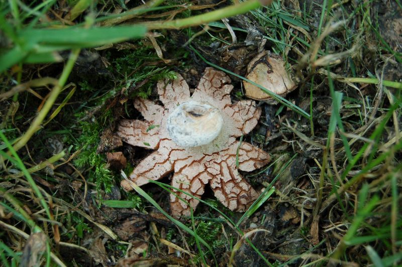 Nach dem Rasenmähen fiel mir heute im Rasen ein halber "Hexenring" aus merkwürdigen Pilzen auf, die alle wie kleine Sterne aussahen. Ich kenne sie nur aus dem Lehrbuch und vermute, dass sie ziemlich selten sind (Bot.Bez.: /*Geastrum rufescens*/???
