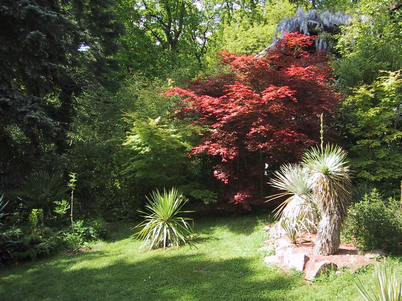 Hoffentlich funktioniert mein PC wieder einigermaßen. In der Bild-Anlage Y.thompsoniana mit rostrata u. li recurvifolia vor Acer palmatum shindeshojo u. Acer p.seiryu in der Abendsonne!