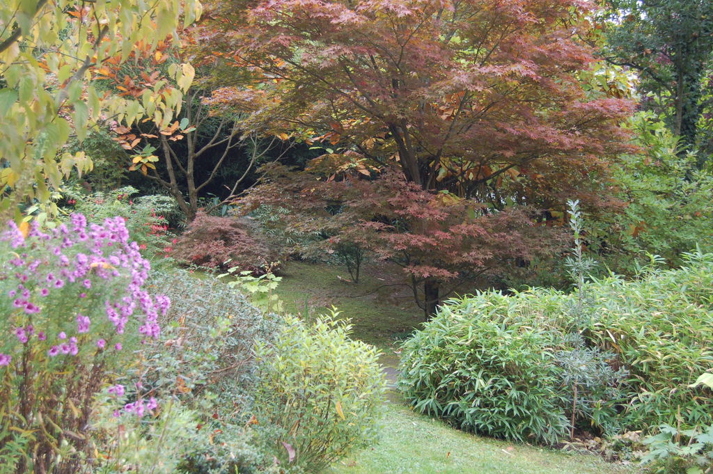Im südlichen Teil des Garten (unteres Ende des Hanges) schaut man Ri Osten auf Acer palmatum Atropurpureum und li Davidia AM#