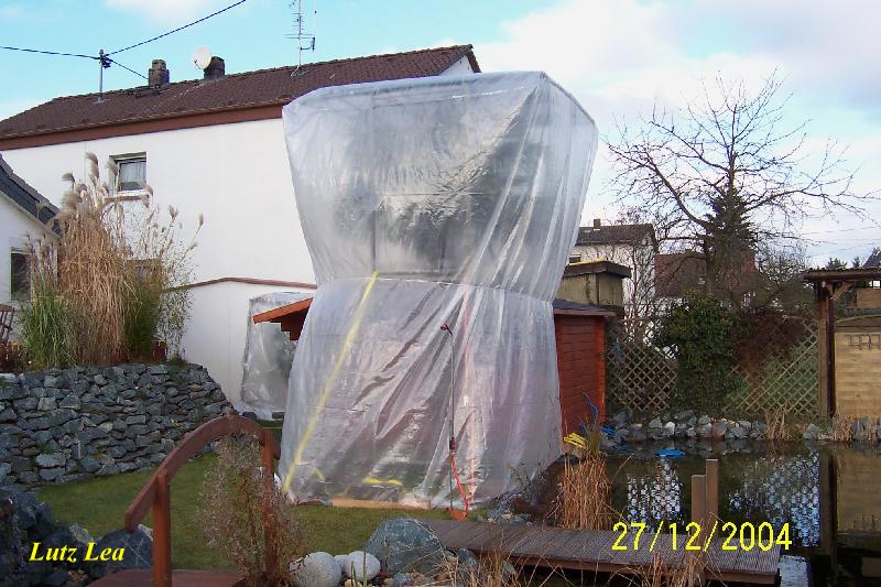 eine im Frühjahr 2004 ausgepflanzte etwa 4 m hohe Hanfpalme in Egelsbach, die ich vor kurzem hier im 'Forum' mit Bild (ungeschützt) vorstellte, ist dieser Tage nun auch zur Sicherheit mit einer Folienverbauung (innen Stahlrohrgestell) geschützt worden.