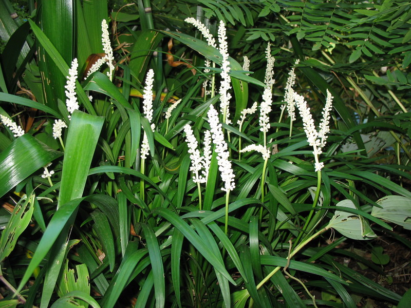 dazu als Kontrast eine der eher seltenen weißblühenden Sorten wie /*Liriope muscari 'Monrows White'*/ oder mit ins Purpurne gehenden Blüten wie 'Royal Purpe' bzw. die buntblättrigen Sorten wie 'Variegata', 'John Burch', 'Golden Banded',...etc.