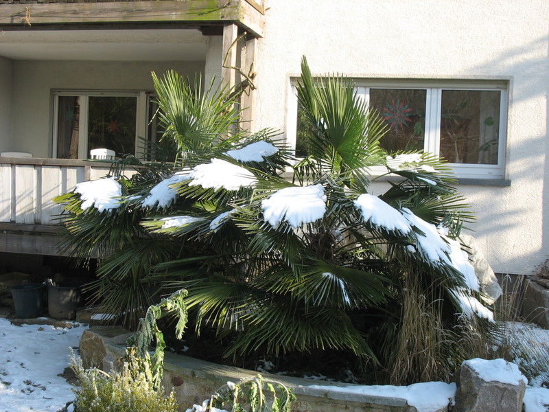 Meine beiden Trachycarpus fortunei sehen noch richtig gut aus, nur dick am Fuß gemulcht. Melianthus major, im Vordergrund, hats erwischt, auch wenn er noch so grün aussieht. Selbst die letzten beiden Mildwinter hat er oberirdisch nicht überstanden.