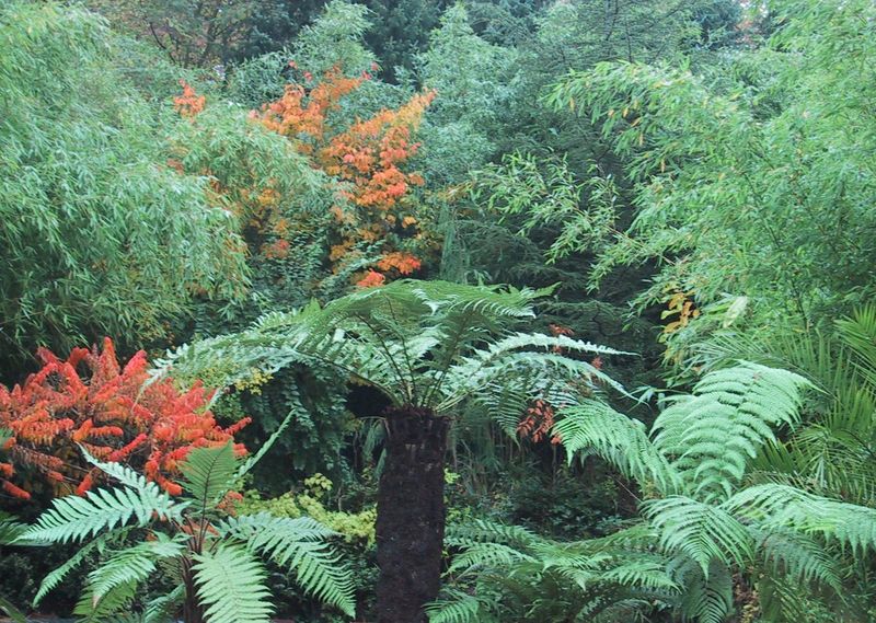 Auch diese Aufnahme - mit etwas mehr Abstand (m.E. kommen hier die Phyllostachys-Arten im Hintergrund besser raus) mit dem gleichen Blickwinkel.Die Dicksonien stehen am Rand vom Wasserbecken einfach aufgereiht u. wurden einfach ohne Topf aufgenommen, auf diese Weise spar ich mir die Reise nach Tasmanien ;-)