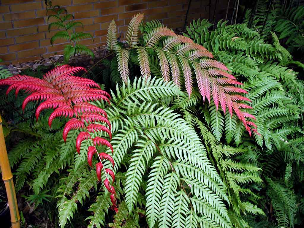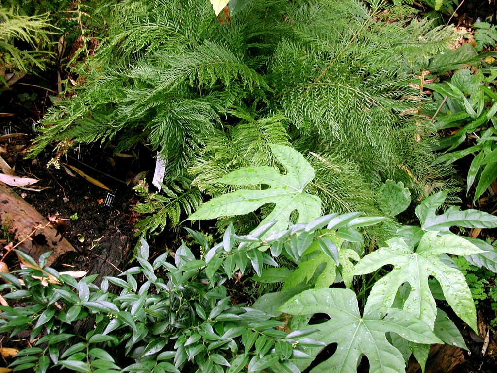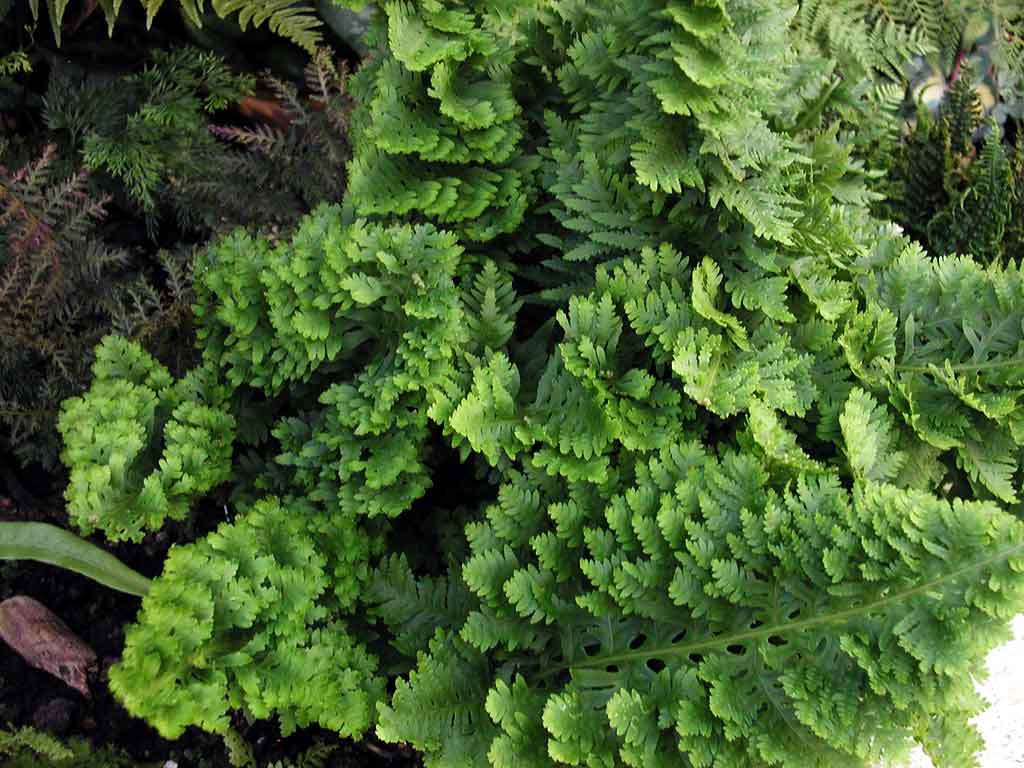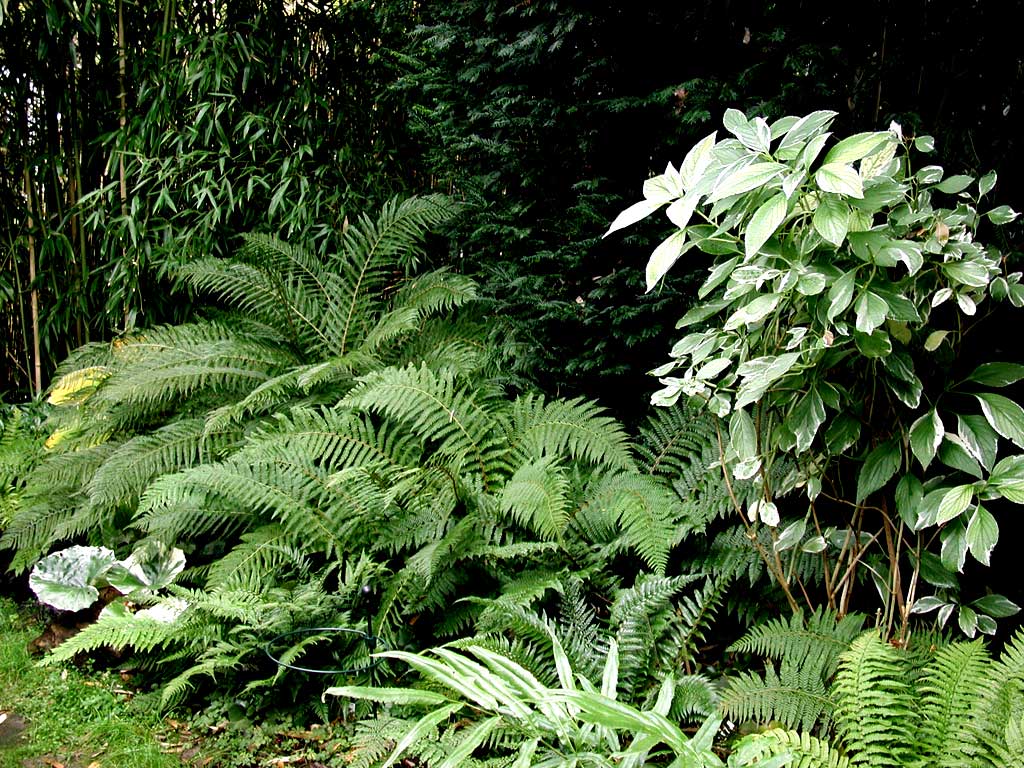 /*Polystichum setiferum 'Greenlace'*/ noch einer der schönen Polystichum, links vorne Sarcococca ruscifolia var. chinensis ?? etwas zweifelhaft.Rechts davon Fatsia polycarpa.