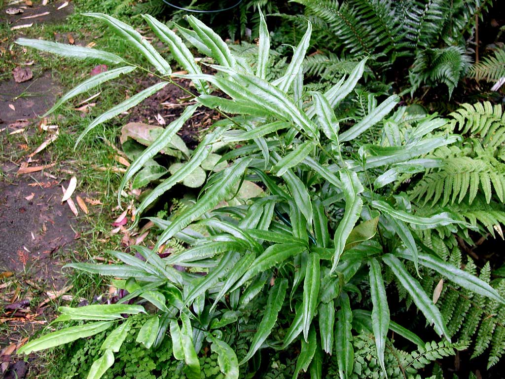 /*Coniogramme japonica*/ mit variegierten Wedeln, die aber im Herbst etwas vergrünt sind, ebenfalls wintergrün.