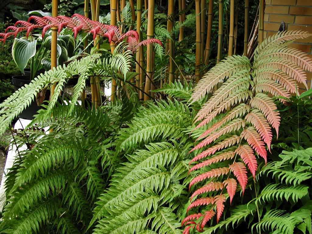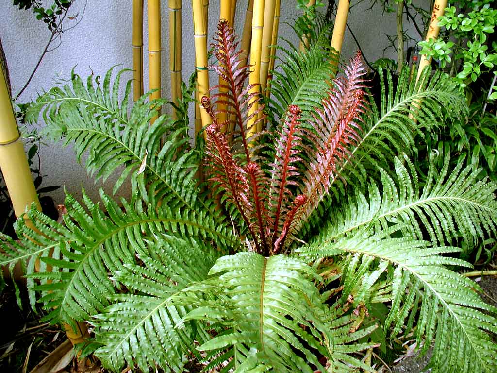 /*Blechnum brasiliense*/ ein diesmal nicht winterharter Farn, stammbildend und mit schönem Austrieb, vor Phyllostachys vivax aureocaulis.