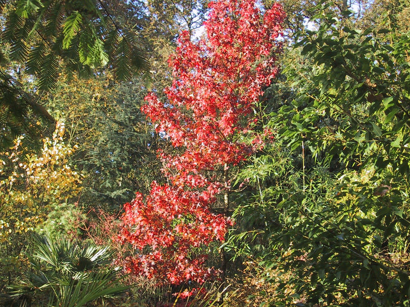 Hi li: Cercis siliquastrum(gelb),hellgrün:Cunninghamia,blaugrau:Cedrus deodara Karl Fuchs,feuerrot:Liquidambar styraciflua, re:/*Quercus myrsinifolia*/(dunkelgrün).das Ganze eingerahmt von Metasequoia glypt.(gelbgrün)