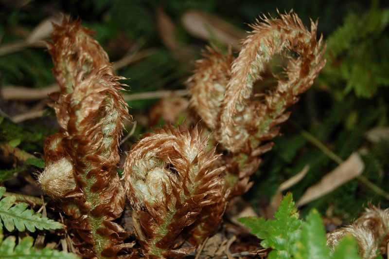 /*Polystichum polyblepharum Bornim*/ im Austrieb, ein immergrüner Schildfarn aus Japan (Die Japaner nennen ihn 'Inode', d.h. Bärentatze), leider ist er etwas spätfrostgefährdet.Wedellänge ca 60cm, erstaunlich trockenresistent! und wunderschön!