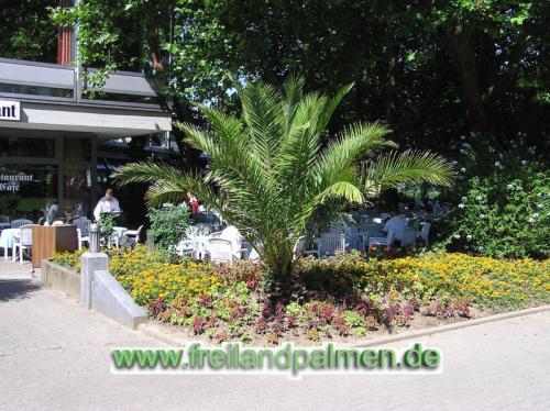 Auch etwas neues konnte ich entdecken. Beim Kurhaus wo die Trachys stehen ist nun eine Phönix Canariensis dazugekommen. Dort war soviel ich weiß eine größere Yucca, die ganz verpilzt war und nicht mehr schön aussah. Die Phönix ist nicht! im Topf auch nicht im Topf versenkt! Sie ist ausgepflanzt und hat bereits eine stattliche Größe von ca. 3 m und einen Stammansatz, der auch schon etwas dicker ist.
