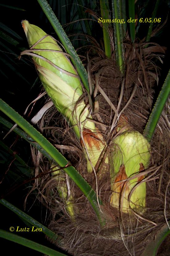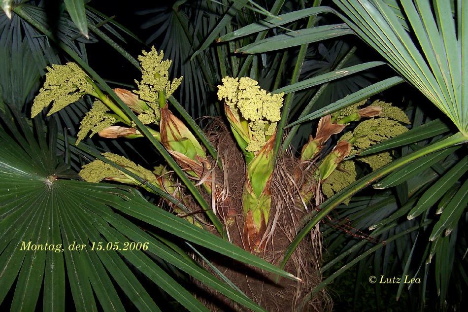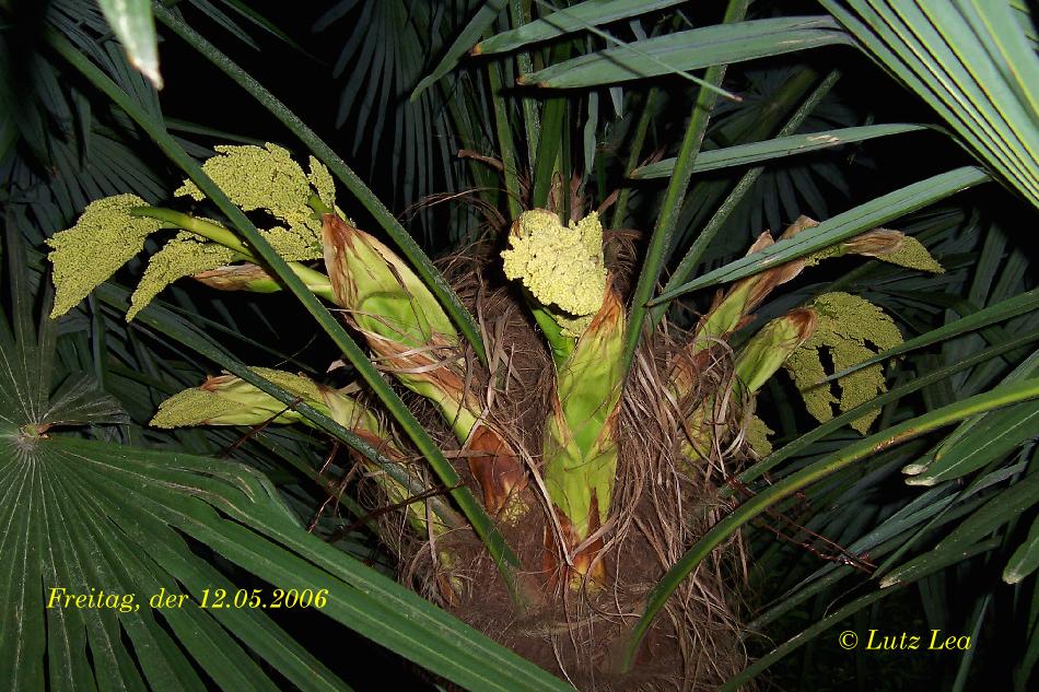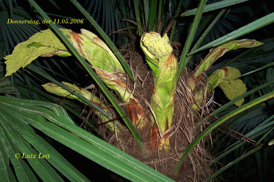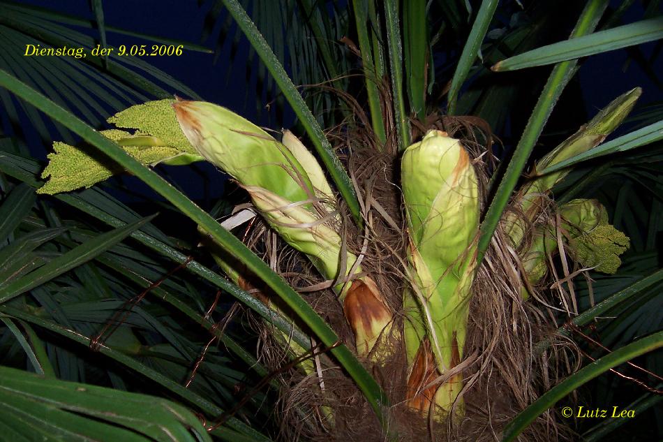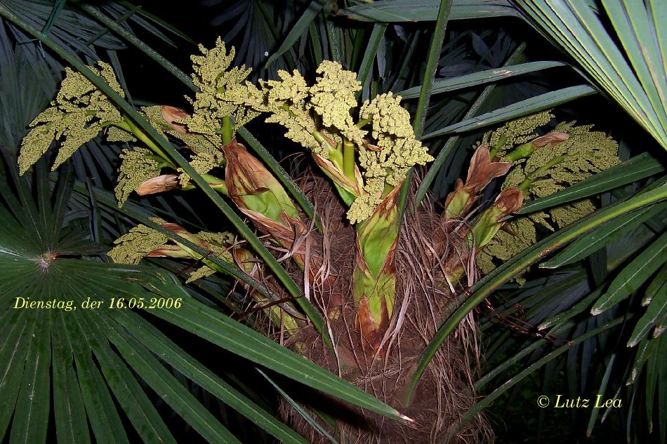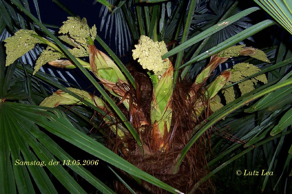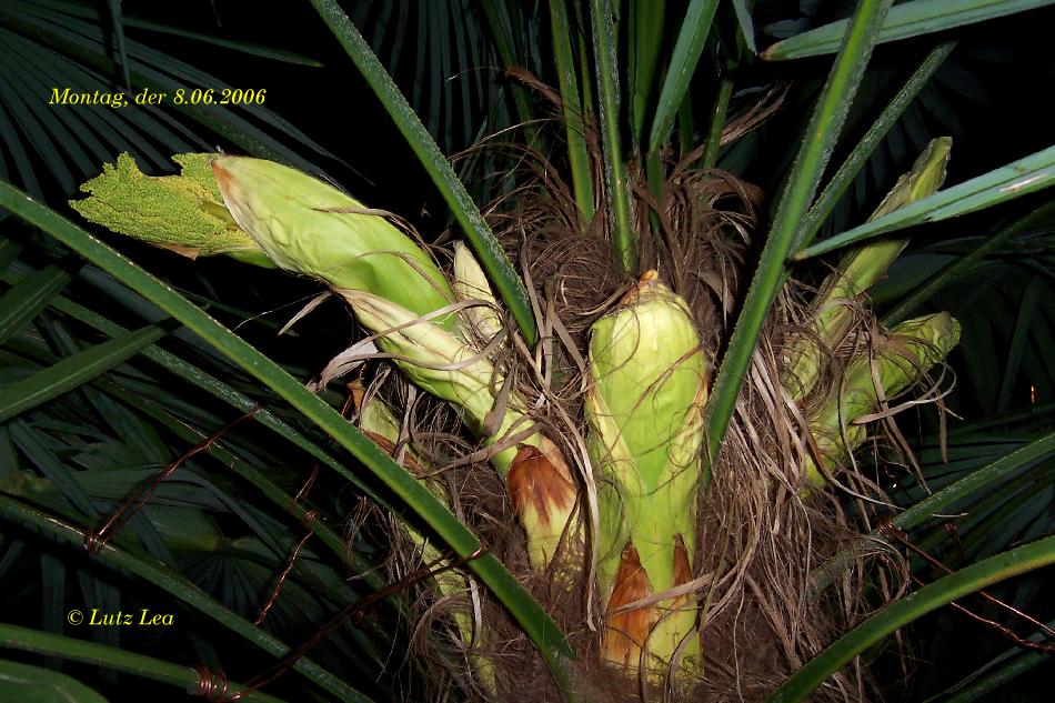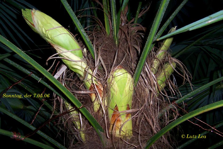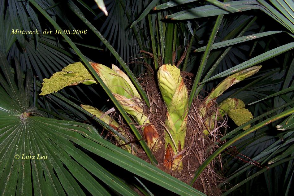 etwas verspätet zeige ich Euch heute die Blütenentwicklung unserer weiblichen Trachy an der Terrasse, im ein Tag-Verlauf (24 Std.-Folge), vom 6.05.06-16.05.06.