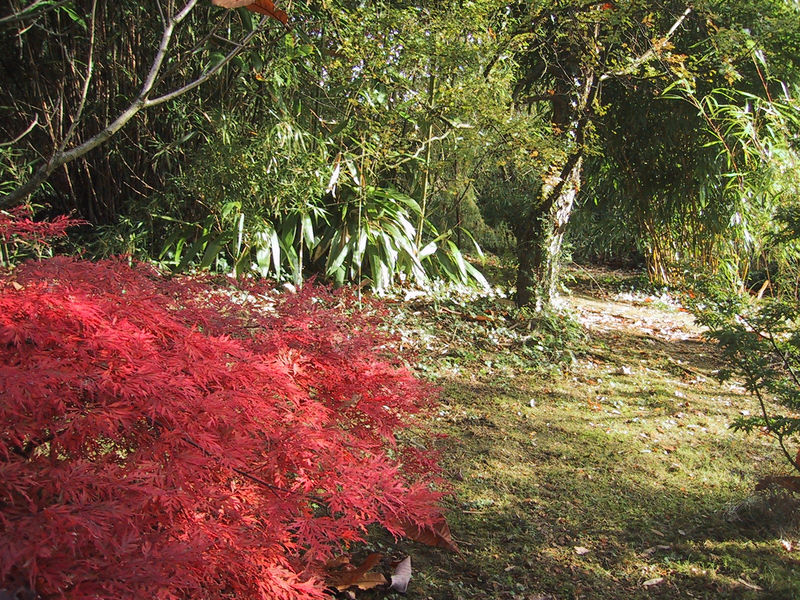 /*Acer palmatum Orangeola*/, leuchtend lachsrot vor versch. Bambusarten und einer alten Südbuche, die mindestens 8m hoch sein dürfte